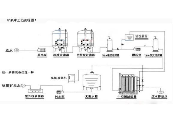 市場上大部分礦泉水屬于鍶(Sr)型和偏硅酸型。礦泉水設備以進口零配件為主,自來水加壓泵用來提高系統供水壓力;多介質過濾器可清除水中的懸浮物、雜質等;活性炭過濾器可清除水中余氯、異味物質和異味氣體,改善口感;精密過濾器進一步去除水中雜質,中空超濾器可將水中雜質、膠體、酚類化合物、氯化物、細菌等各種有害物質清除掉,并將水中有益的各類礦物質保留在水中。