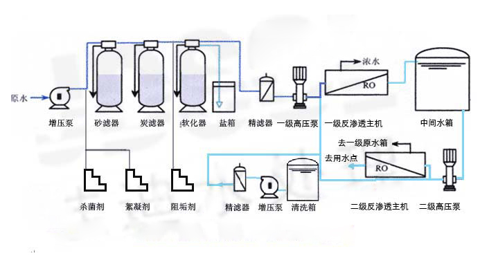 雙級反滲透是通過一級反滲透將鹽份脫除95-97%后,一級反滲透大水利用率為75%,再通過二級反滲透將水中的鹽分近一步脫除,通過中間加堿調節PH到8.3左右,產水水質可達1-2μS/CM2,是當今醫用供純水設備的主要制取工藝,雙級反滲透通的產水也是EDI系統的優質進水,所以通常也作為EDI的前處理工藝。