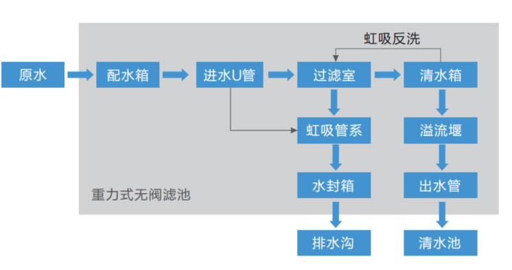 重力式無閥濾池由分配水槽、進水管、過濾室、集水區、連通管、沖洗水箱、溢流槽、虹吸上升管、虹吸下降管、虹吸輔助管、抽氣管、排水水封箱、虹吸破壞管、虹吸破壞斗、強制虹吸裝置、強制破壞裝置等組件構成,是集水力學、結構學、空氣動力學為一體的凈化水裝置。
