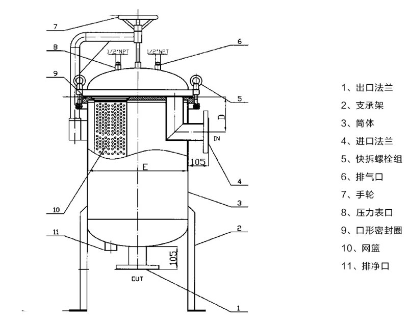 袋式過濾器是一種壓力式過濾裝置,主要有過濾筒體、過濾筒蓋和開啟機構(gòu)、加強網(wǎng)等主要部件組成。