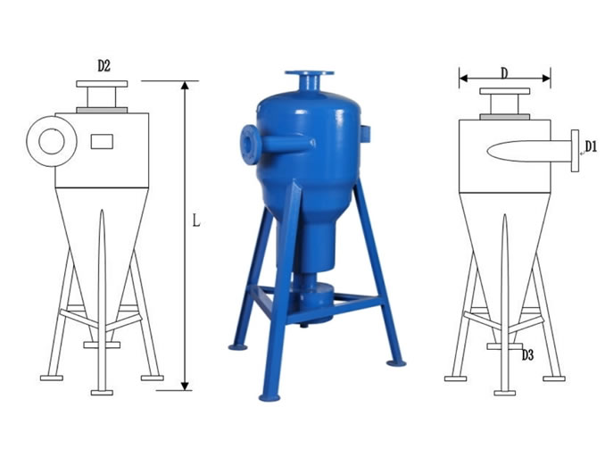 旋流除砂器是根據離心沉降和密度差的原理,當水流在一定的壓力下從除砂進水口以切向進入設備后,產生強烈的旋轉運動,由于砂和水密度不同,在離心力、向心力、浮力和流體曳力的共同作用下,使密度低的水上升,由出水口排出,密度大的砂粒由設備底部的排污口排出,從而達到除砂的目的。