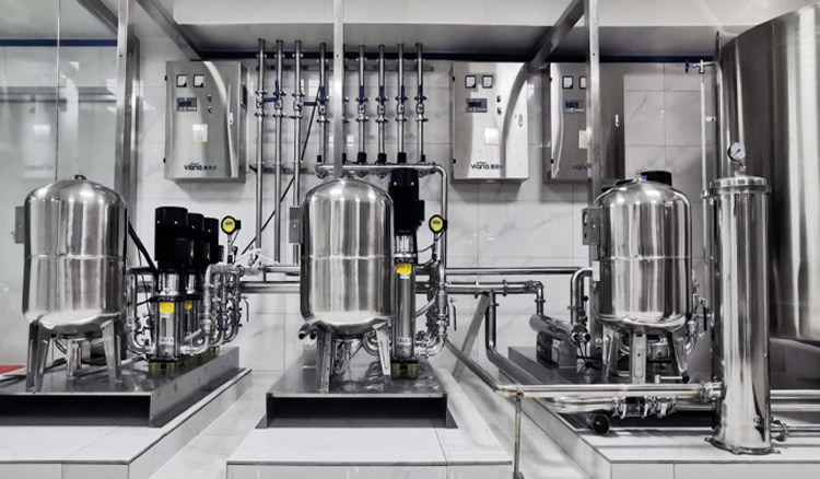原水→加壓泵→石英砂過濾器→活性炭過濾器→軟化→保安過濾器→反滲透→臭氧→出水