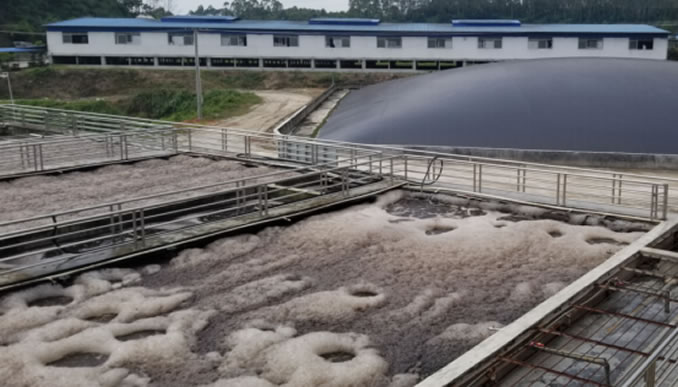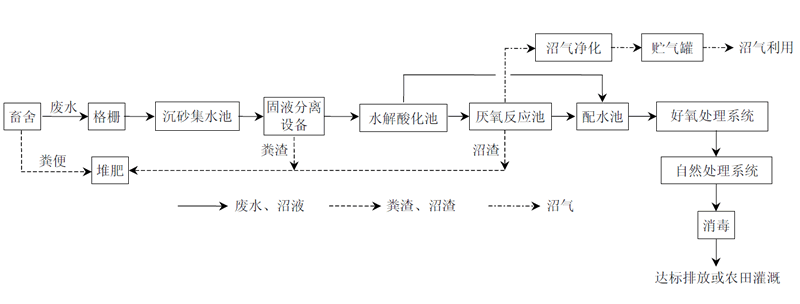 養殖廢水主要來源于養殖畜禽尿液,殘余糞便,飼料殘渣以及沖洗水和部分生活污水。養殖廢水水質水量變化大,懸浮物多,有機物濃度高,氨氮含量高,含有重金屬和致病菌并伴有惡臭。養殖廢水中的污染物主要以固態,溶解態的有機物形式存在,使廢水BOD,COD,SS和色度等含量很高,污染物可生物降解性好,此外廢水中含有N,P等營養物質,廢水中的固體殘渣主要是有機物質。因此,養殖廢水先采用物理預處理進行固液分離,然后經厭氧處理將大分子有機物質分解成小分子物質,再經過好氧處理進一步去除有機污染物,最后經消毒出水達標排放。